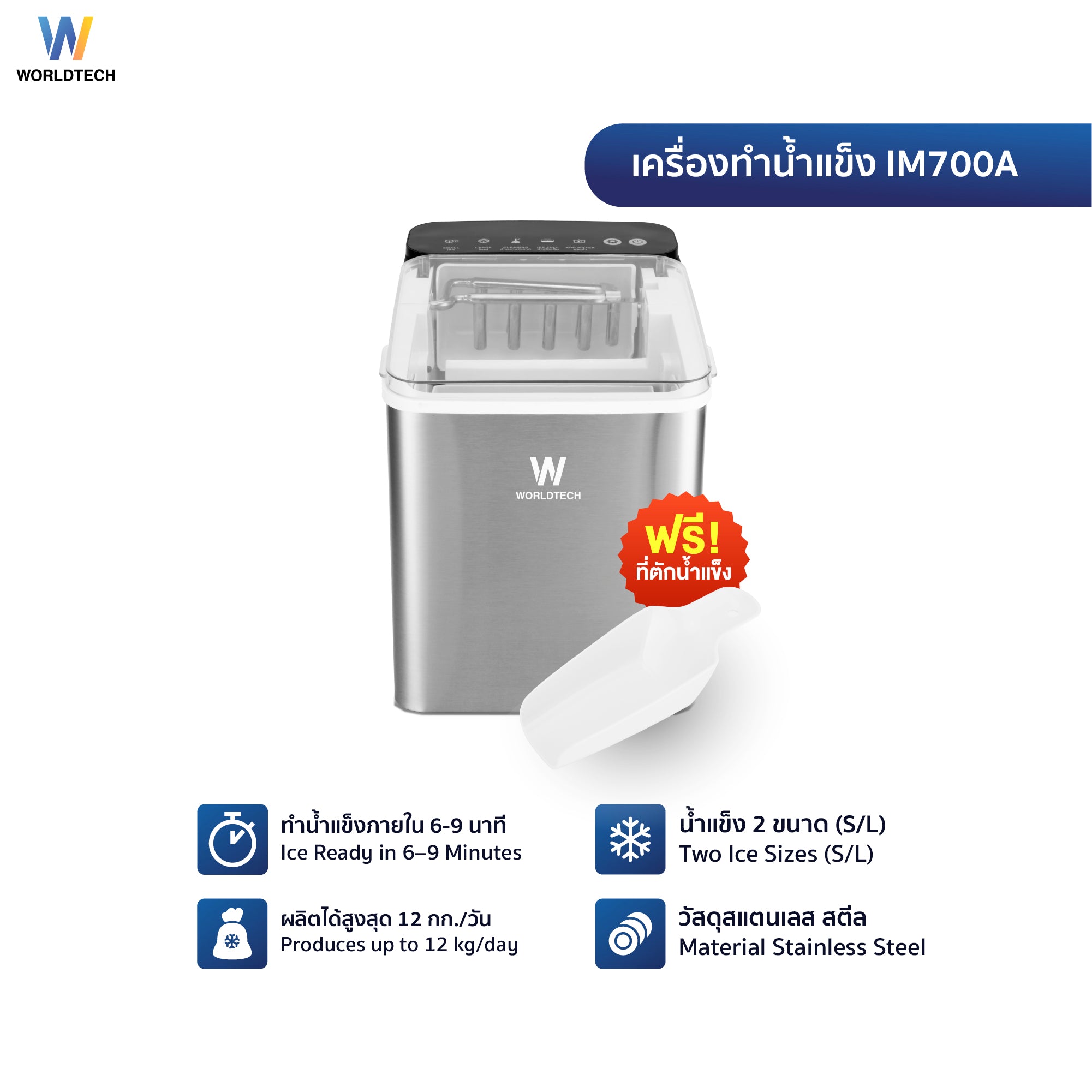 Worldtech เครื่องทำน้ำแข็งอัตโนมัติ รุ่น WT-IM700_Silver ทำน้ำแข็งใน 6-9 นาที Ice Maker+ แถมฟรีที่ตัก