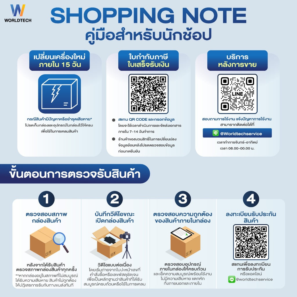 เงื่อนไขการรับประกันเปลี่ยนใหม่ ไม่รอซ่อมภายใน 6 เดือน ครอบคลุมเฉพาะออเดอร์ที่สั่งซื้อผ่าน Website Worldtech เท่านั้น โดยนับตั้งแต่ 5 ก.ค. 68 เป็นต้นไป