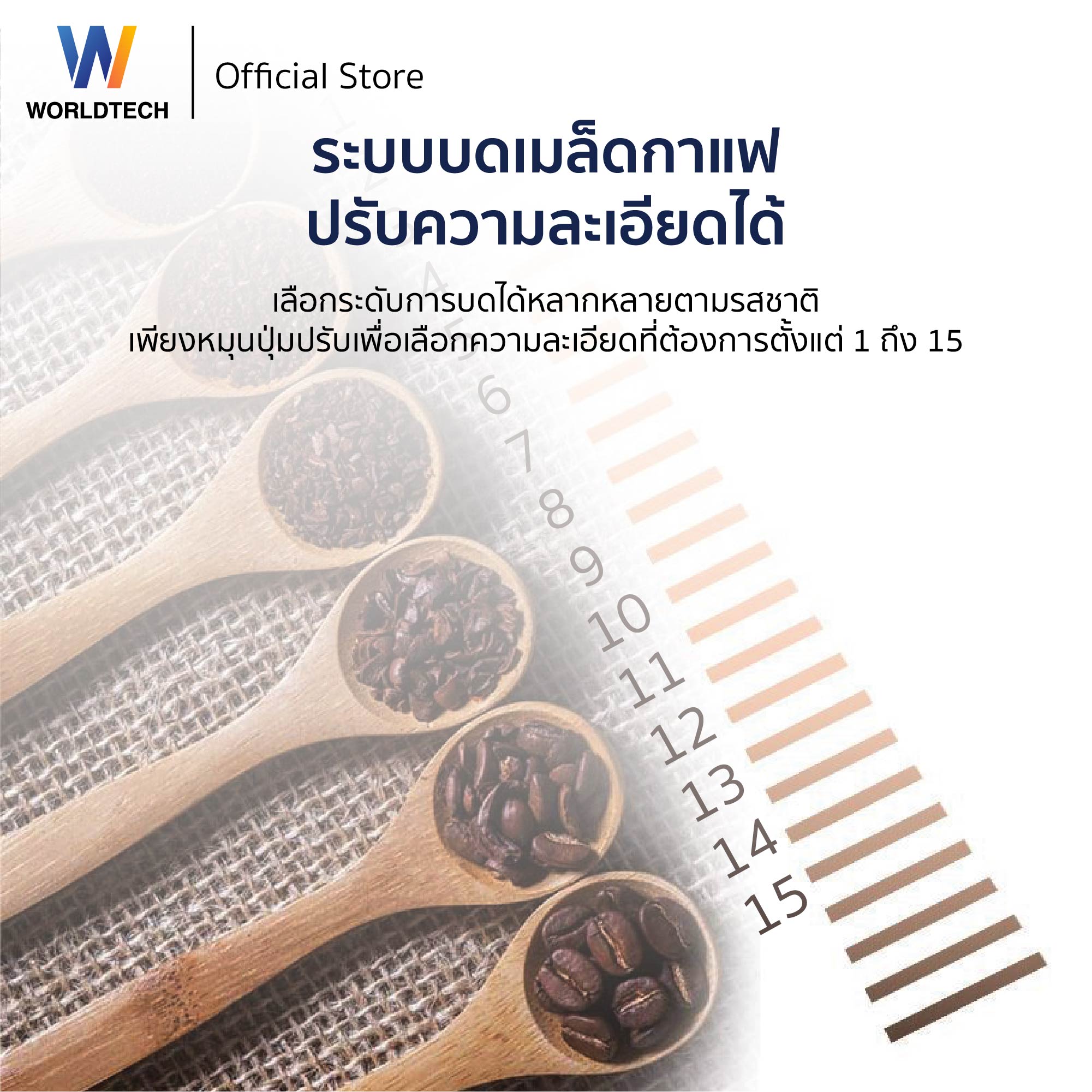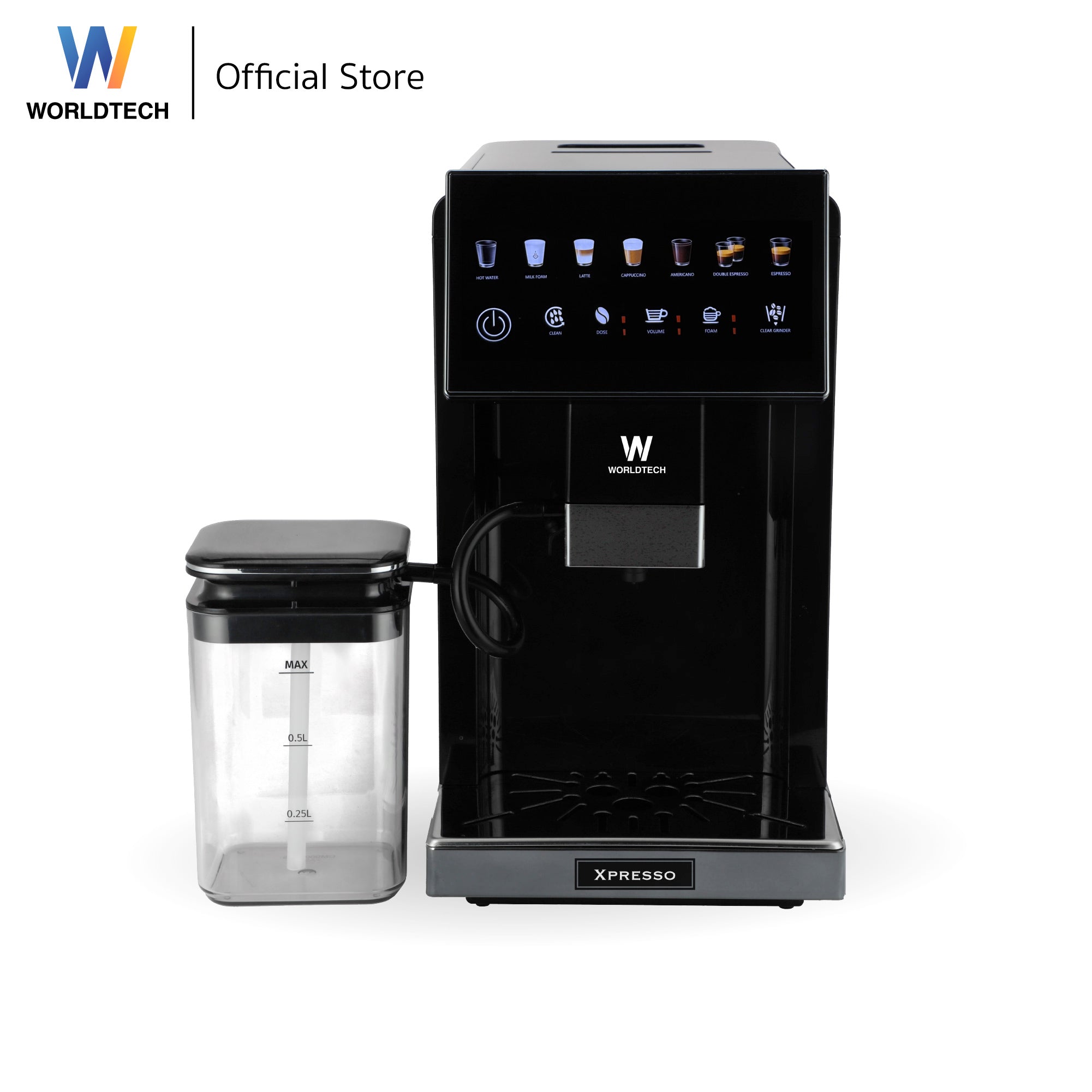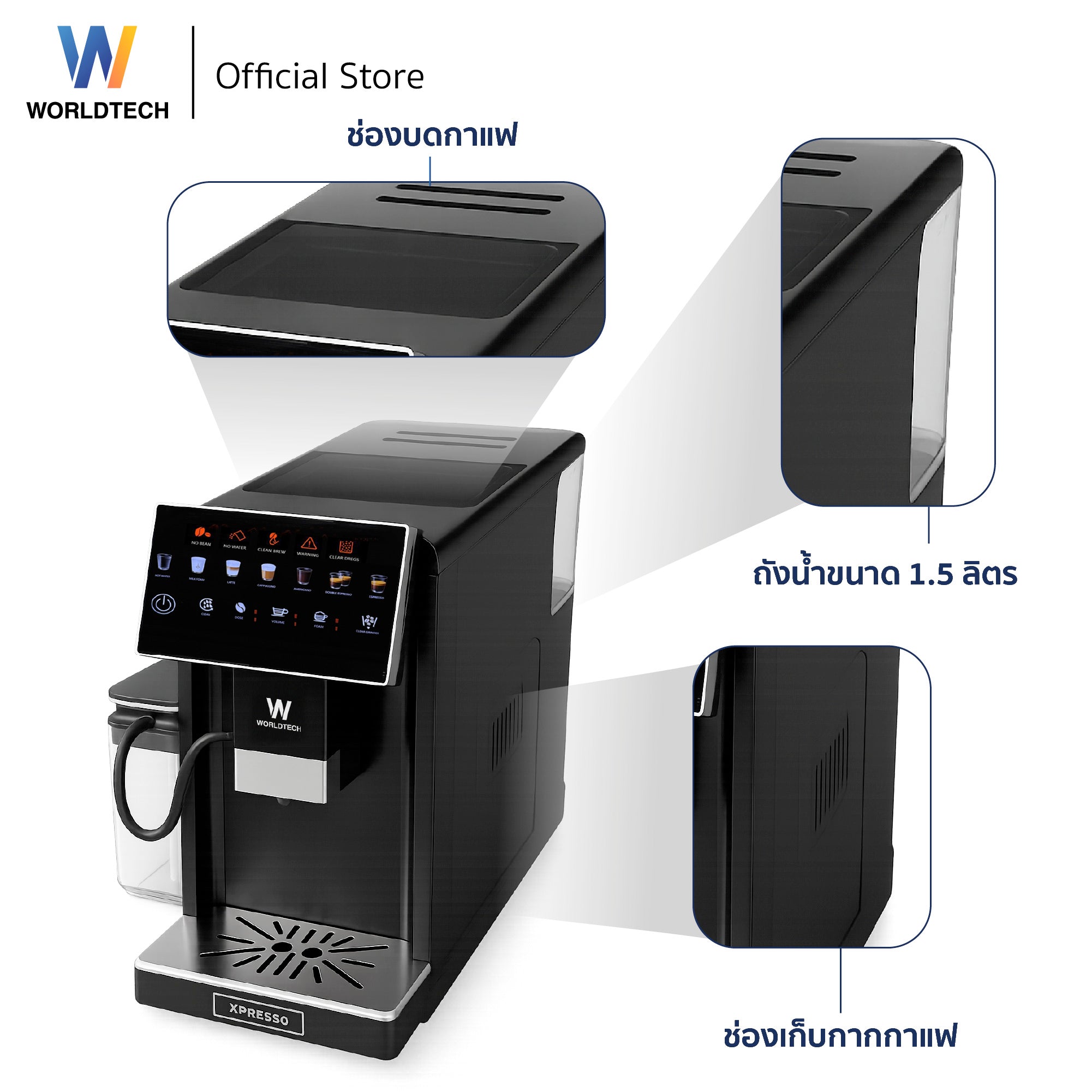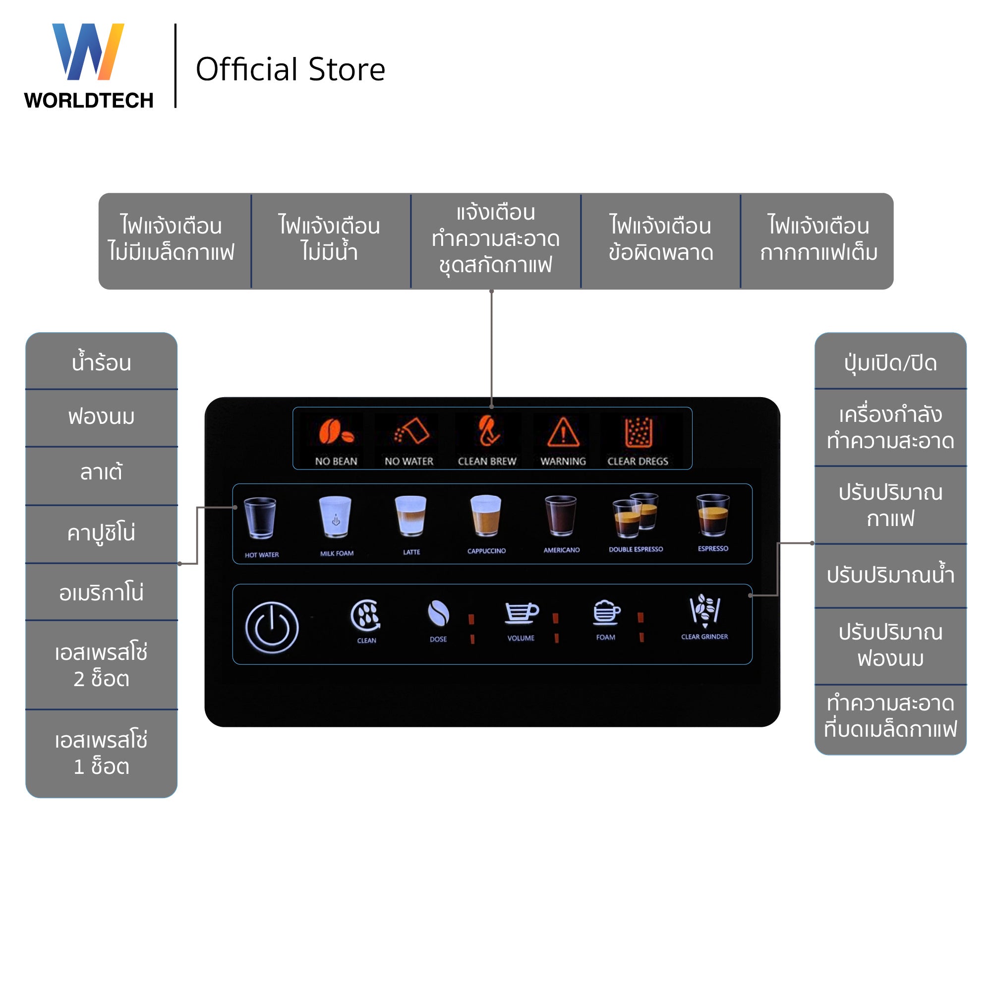 Worldtech เครื่องชงกาแฟอัตโนมัติ พร้อมระบบฟองนม | บดเมล็ดกาแฟในตัว | หน้าจอสัมผัส | ฟังก์ชันล้างอัตโนมัติ