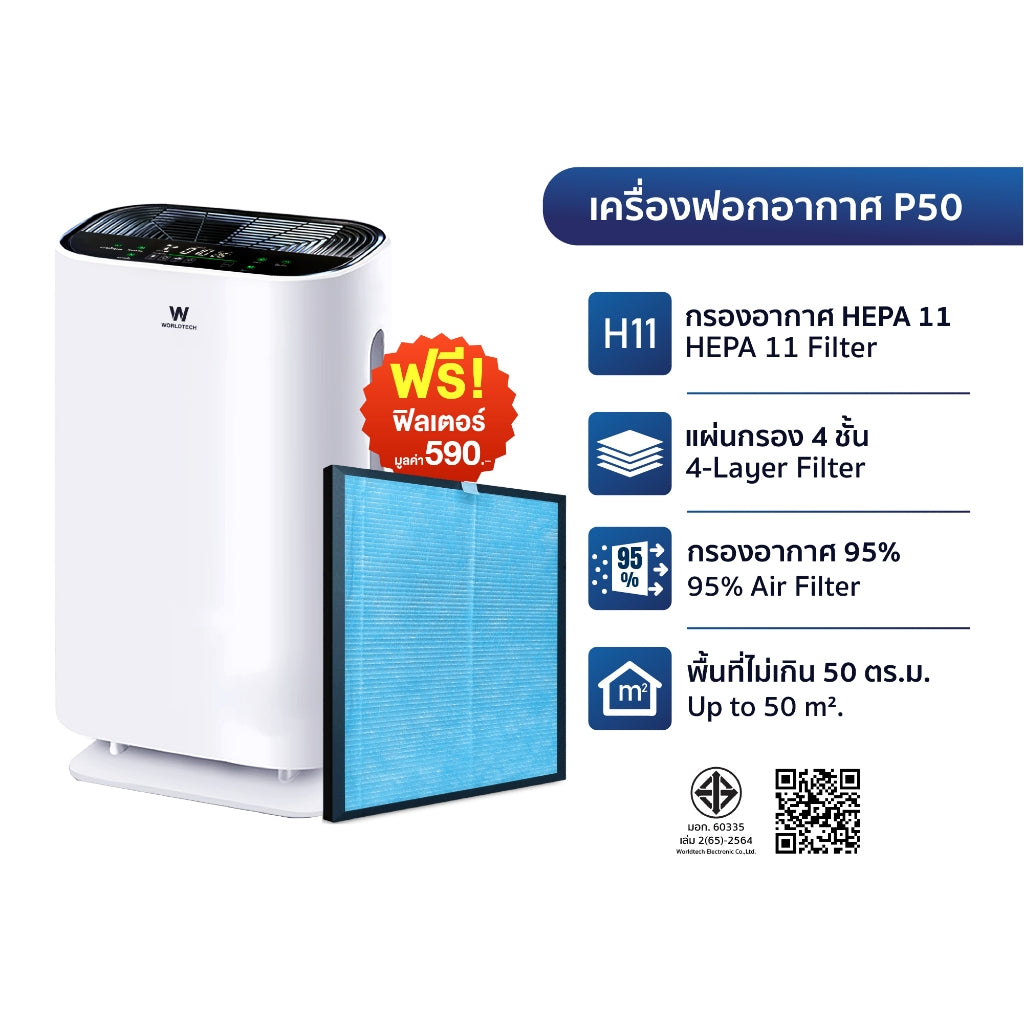 Worldtech เครื่องฟอกอากาศ Air Purifier รุ่น WT-P50 มอก.รับรอง พื้นที่ 40-50 ตร.ม. + รีโมท ประกัน1ปี
