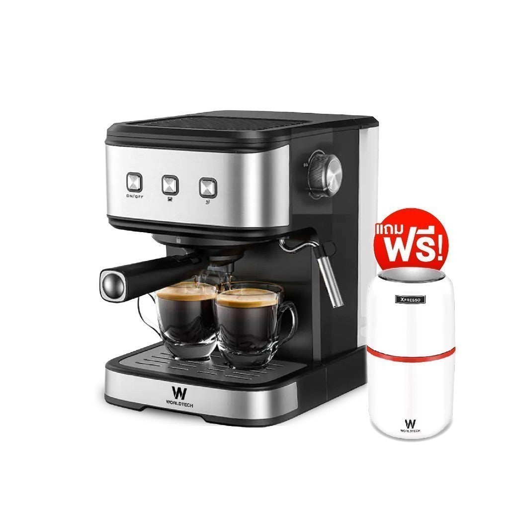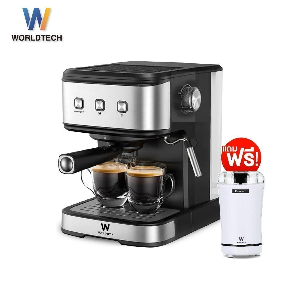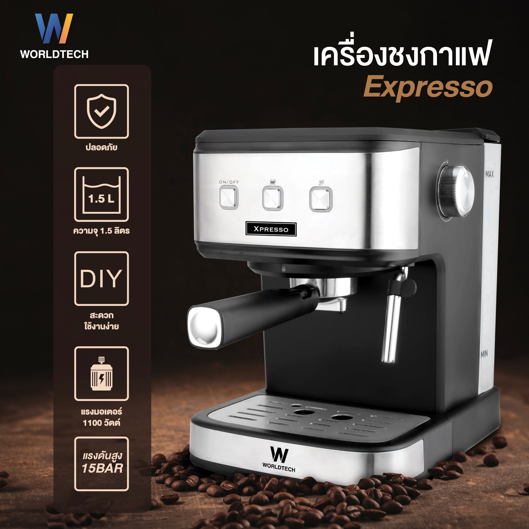Worldtech Xpresso เครื่องชงกาแฟเอสเปรสเข้มข้น เครื่องชงกาแฟ เครื่องทำกาแฟเอสเปรสโซ่ ปรับความเข้มข้นของกาแฟได้ สกัดด้วยแรงดันสูง 15 บาร์ + พร้อมชุดด้ามชงกาแฟ รับประกัน 1 ปี