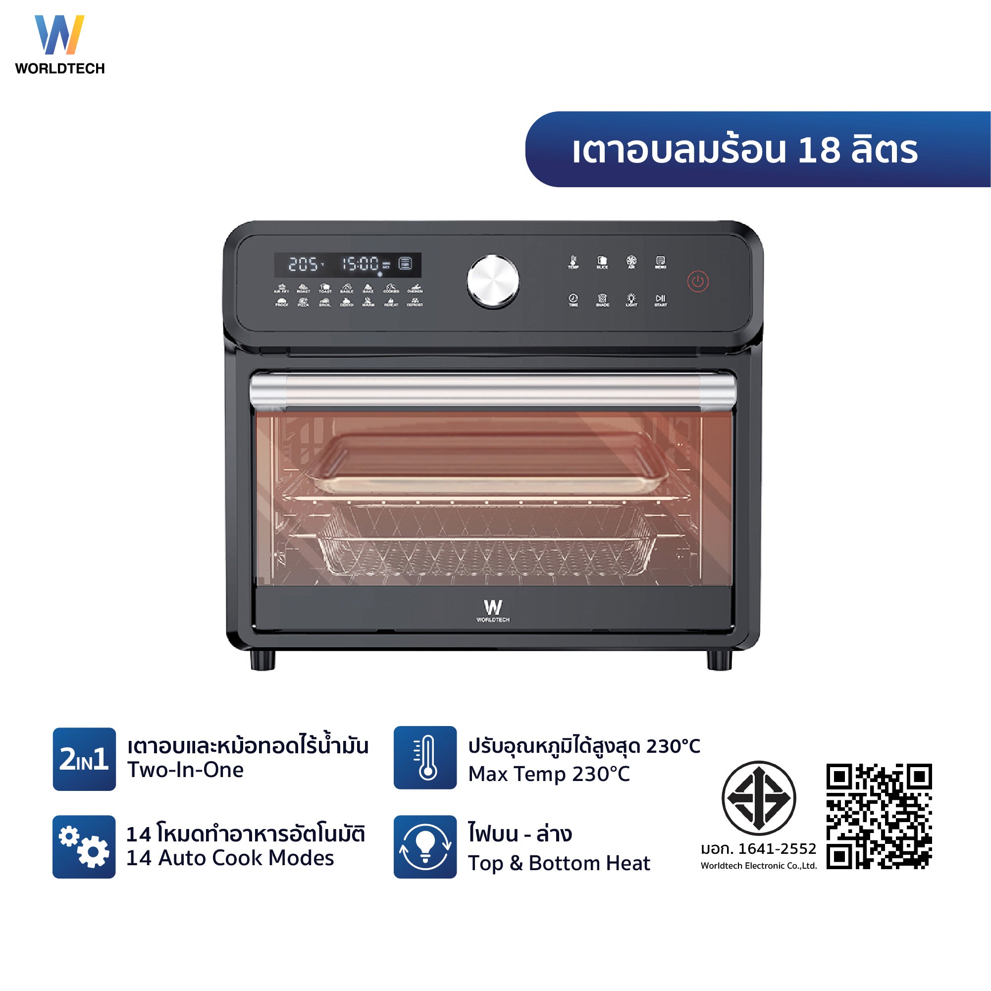 Worldtech เตาอบ ลมร้อนอเนกประสงค์ ความจุ 18 ลิตร 14 โปรแกรม ความจุใหญ่ ฟังก์ชันครบ พร้อมจอ LED รุ่น WT-TO5719