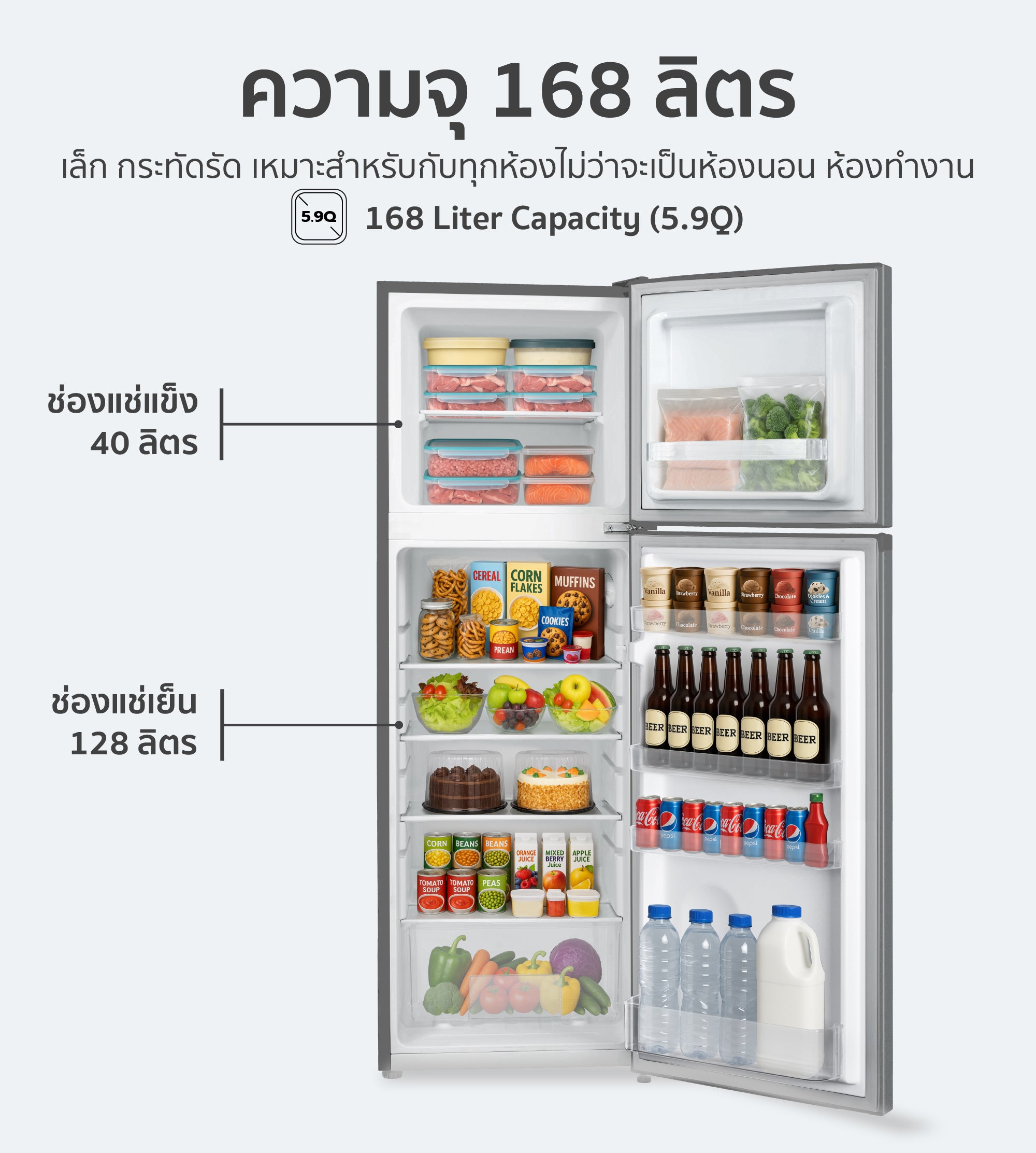 ความจุรวม: 168 ลิตร (5.9 คิว)