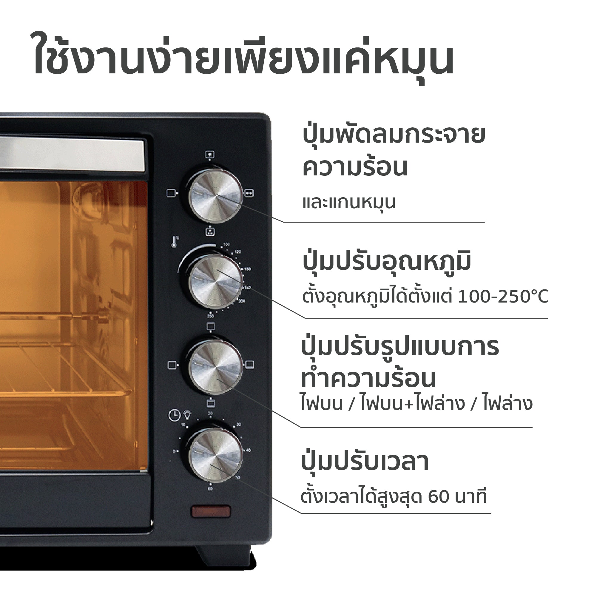 • ใช้งานง่าย: ควบคุมด้วยปุ่มหลัก 4 ปุ่ม (ฟังก์ชัน Rotisserie และ Convection, อุณหภูมิ, ตำแหน่งความร้อน, และเวลา)