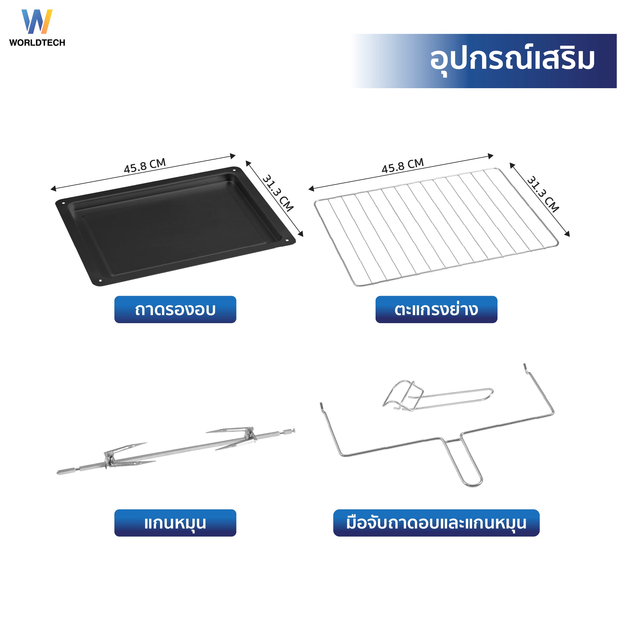 • อุปกรณ์เสริม: ถาดอบ, ตะแกรงอบ, ด้ามจับสำหรับถาดและตะแกรง, แกนย่างไก่ (Rotisserie), และด้ามจับแกนย่าง